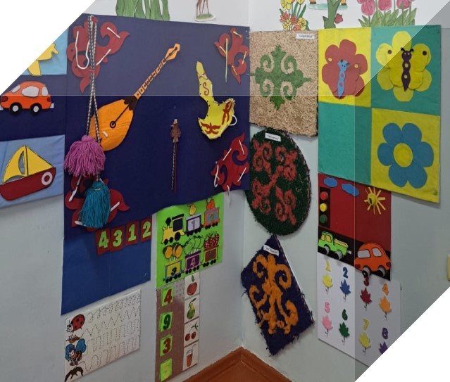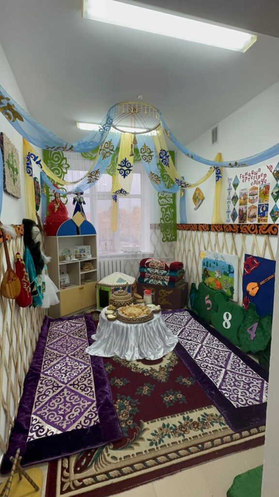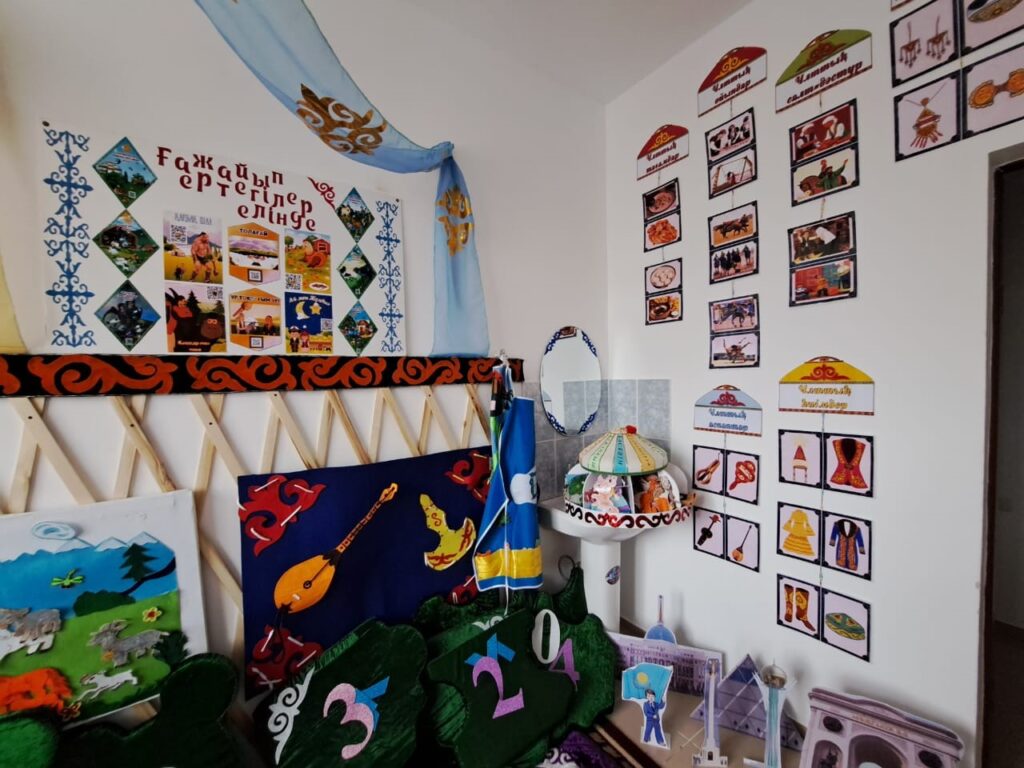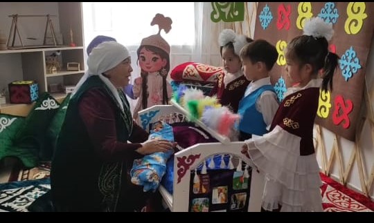 1.Киіз үй- Қазақ халқының  өнер туындыларының бірі қиіз үй, оны  көзбен көру арқылы жабдықтарының атаулары балалардың есінде тез сақталады. Заттық-дамытушы орта ретінде бірінші орыннан екінші орынға ауыстырып қоюға  ыңғайлы ,тез жиналып жылдам құрылады. Киіз үйдің ішіндегі тұрмыстық заттарға, сәнді қолданбалы өнерге балалардың қызығушылығын оята отырып, атауларын үйретеміз. Қазақ халқының қонақжайлық дәстүрлері, қонақты күтіп алу, төрге отырғызу «ас қайыру», «бата беру» қонақты шығарып салу дәстүрлерін үйрету арқылы үлкендерді сыйлауға, дастархан басында әдептілік сақтауға баулимыз, қазақтың ертегілерін сахналауға қолданамыз.